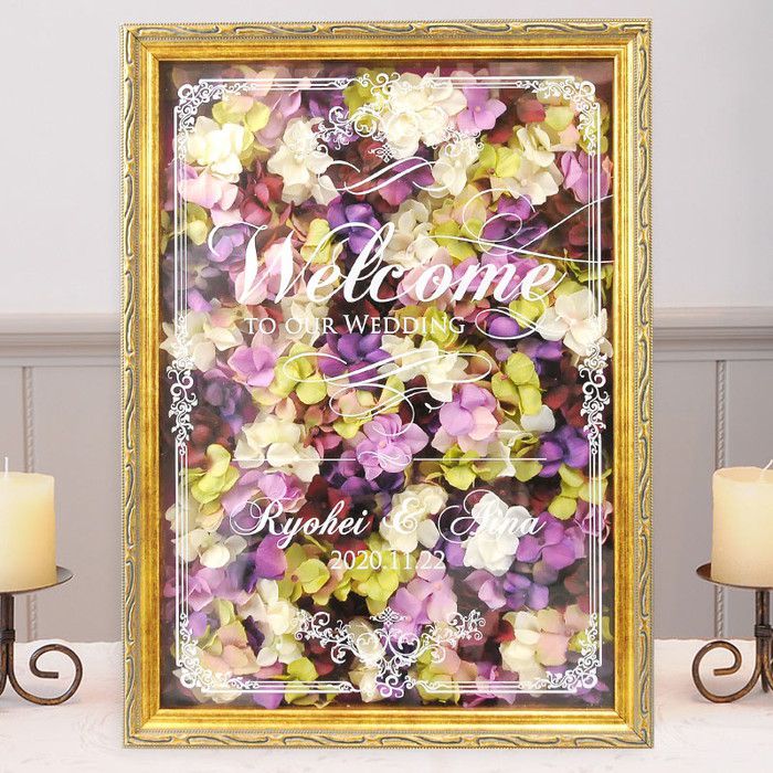 厚みのあるゴールドのフレームにパープルのお花をぎゅっとしきつめたボードは、ウエルカムボードとして、