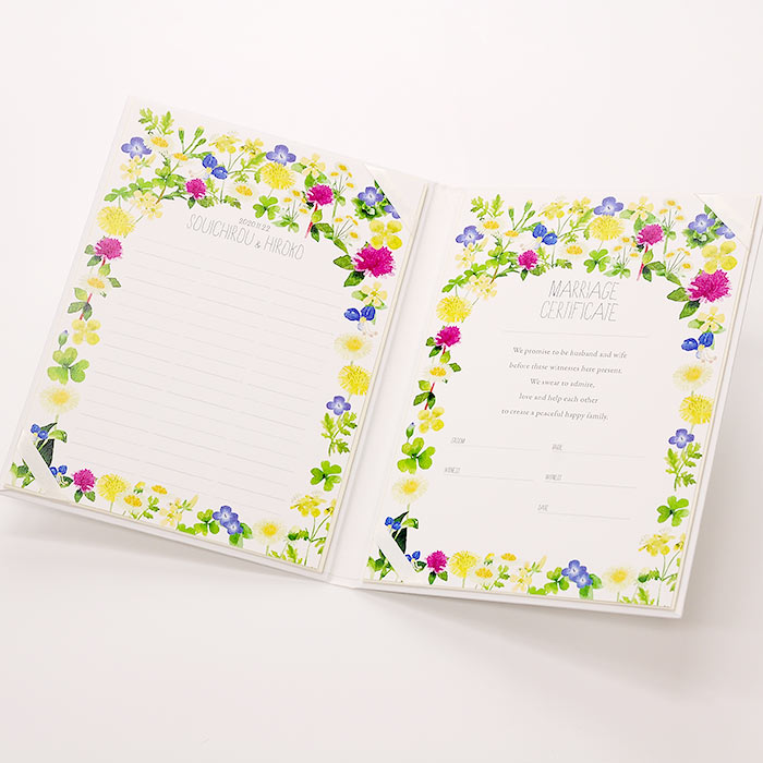 人前式のお二人にピッタリの演出アイテムの一つが、ゲストにも参加いただく結婚証明書。リングの箔押しがポイントのホワイト台紙を開くと、カラフルなお花のイラストが目を引きます。
