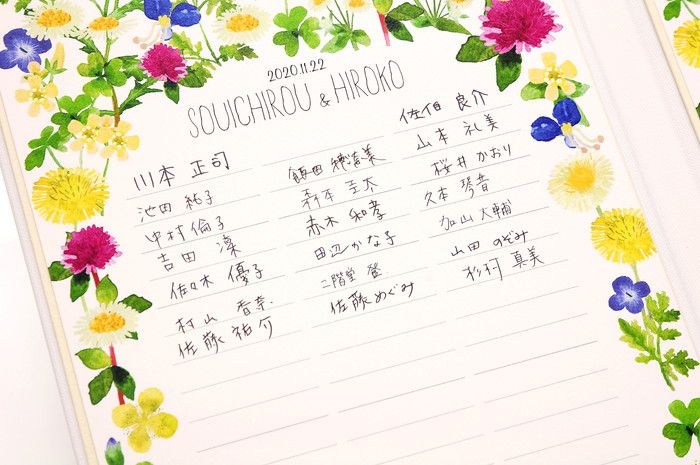 パープルの小花がアクセントになってかわいらしさをさらにプラス。51名のサインができる承認シートが2枚入っているので、最大102名もの承認サインが可能です。お二人だけのオリジナル結婚証明書が完成します!
