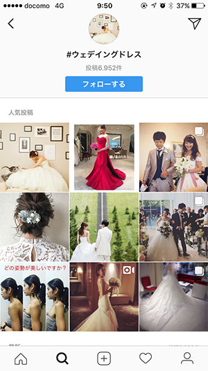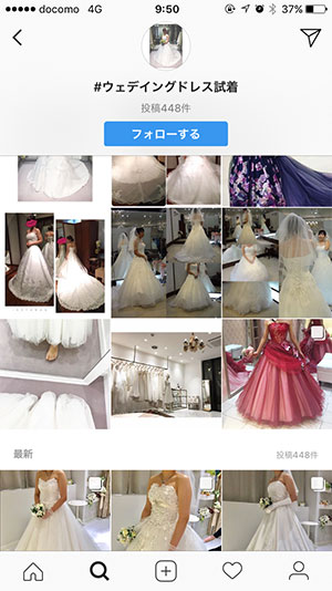 写真投稿SNSです。最新順にずらっと写真を見ることができ、こうなりたい、ああしたいというイメージが湧きやすいですね。まずは「#ウェディングドレス」で検索してみます。