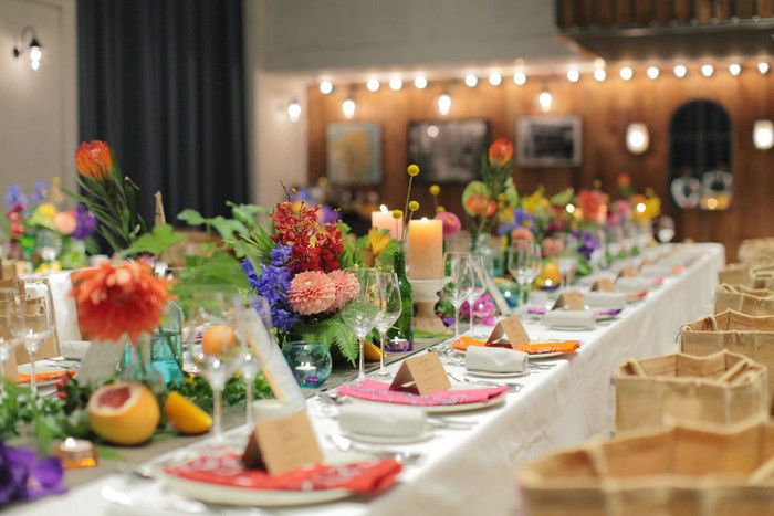 そして、ゲストの方々のテーブルは、おしゃれな流しstyleに。色鮮やかな装花と一緒に飾られたのは、オレンジ、レモン、ライムなどのフルーツの数々!!おふたりがコンセプトに込めた思いの通り、こちらも見ているだけで楽しくなるような素敵な装飾です。