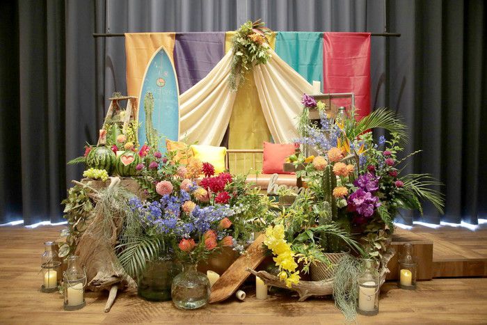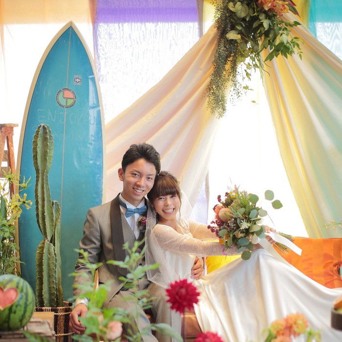 アウトドアが大好きなおふたりらしく、サーフボードやテントモチーフにしたカラフルな布、そしてよく見ると…♡型のくり抜き&『enjoyflue』の文字が入ったスイカまで♡(写真左中央)ちなみに、サーフボードは新郎様が持ち込まれたそう。