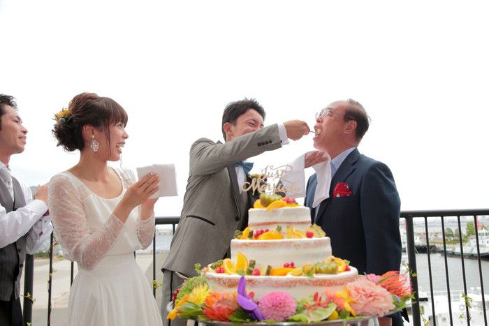 7月挙式にちなみ、7月生まれのゲスト全員にケーキを食べて頂いたそう。新婦様のお父様も偶然7月生まれ!新婦様があげようとしたところ、なんとお父様が新郎様を逆指名!?という盛り上がる展開もあったとか♡