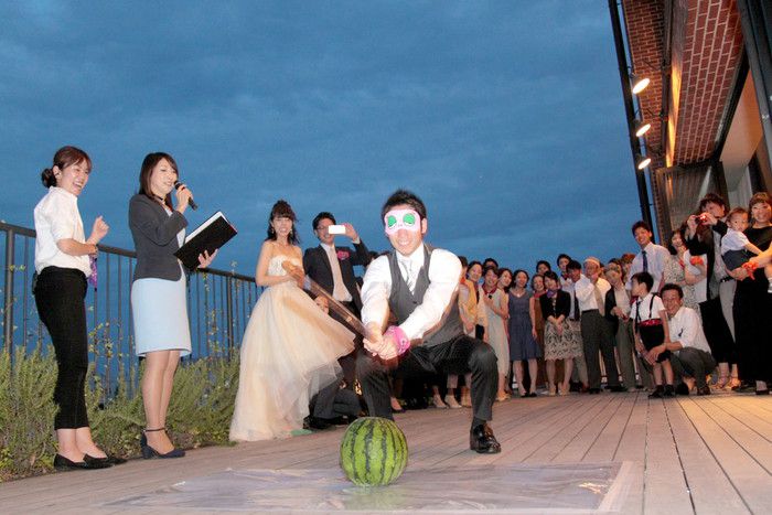 “スイカ割”ならぬ…“ウォーターメロンクラッシュ”!!-summer vacation-といえば!!ということで、どうしてもやりたかったという、こちらの演出。ゲスト5名と新郎様が挑戦し、みんなで誰が一番上手に割るか予想したそう!当たった方にはささやかなプレゼントも♡「みぎみぎー!」「ひだりひだりーー!!」とゲストからも大きな歓声が上がり、とっても盛り上がったそうです。