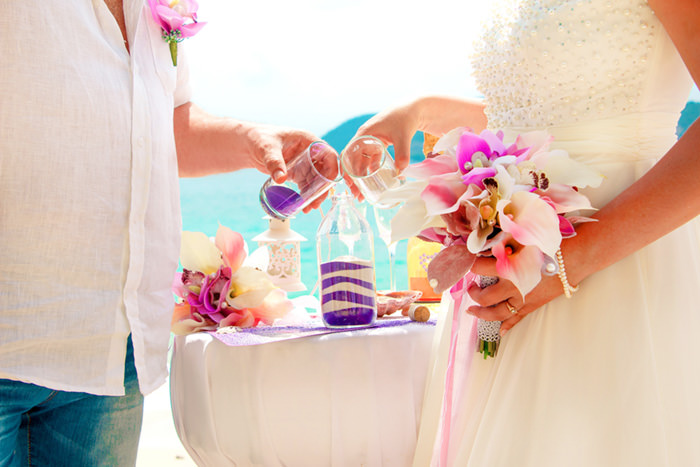 このサンドセレモニーを、結婚証明書にサインをする代わりに、新郎新婦で行う方も多いんです。もしくは、カラーサンドはゲストに入れて貰い、新郎新婦は証明書の代わりに貝殻などのアイテムに署名して、出来上がったカラーサンドの上に飾る…という流れも素敵ですよ。