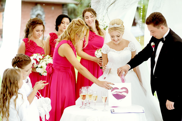 新郎新婦それぞれが異なるカラーサンドを選び、それをひとつの瓶に注ぎ入れることによって、世界にひとつだけの模様が出来上がり、特別な瞬間のオリジナルアートが完成するというもの。