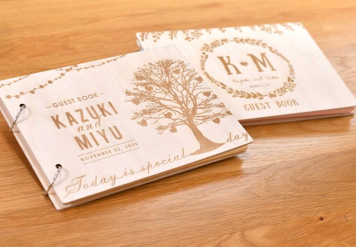 海外のサイトでよく見かける木製のゲストブック。二人の名前やオシャレなデザインが施されていて、受付に置いてあるだけで雰囲気満載。