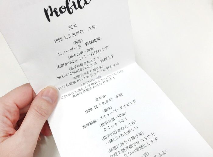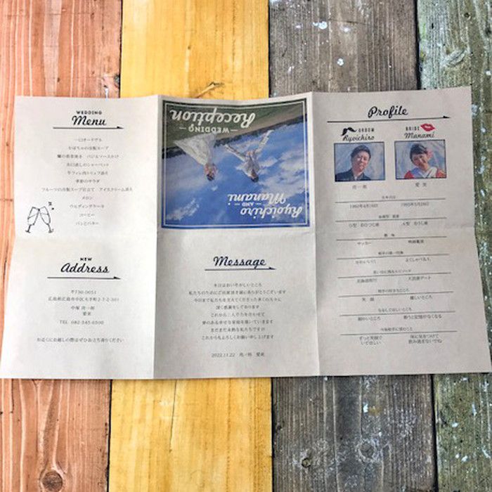 六つ折席次表とは、その名の通り6等分にしてプロフィールなどをデザインし、3回折って完成する作る席次表のこと。パタパタ折りこんで最終的にはこんな風に正方形になる仕様です。