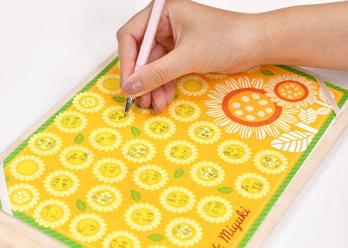 ウェルカムスペースに必要なものといえば、芳名帳。こちらは珍しい寄せ書きタイプのゲストブックです。ひまわりのお花のところにゲストにお名前を書いていただくというもの。