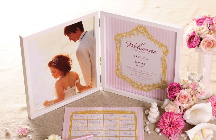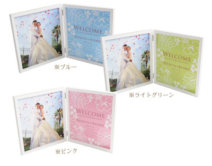 寄書きウェルカムボードのWフレームタイプは仕上がりがコンパクトで、ウエルカムスペースが狭かったり卓上でのレイアウトを想定されている他、式後に飾る場所を決めている場合におすすめです。
