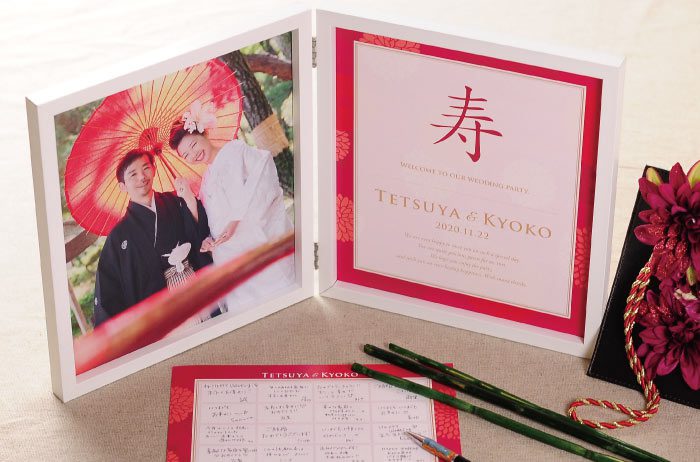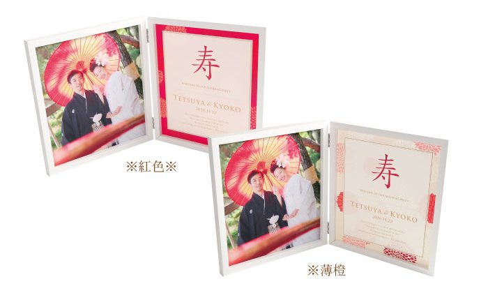 和婚にぴったりなモダンのデザイン。ぱきっとした紅色と、はんなり優しい薄橙の2色でご用意しています。ウエルカムボードにしたときも小さいながら負けないインパクトの「寿」がゲストをご案内。