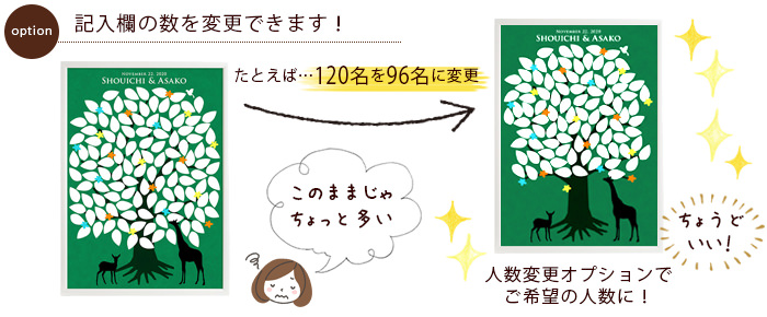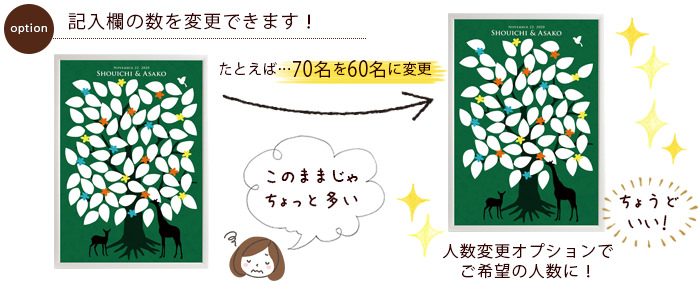 70名記入できるA2サイズのメッセージボードを60名分の枠に減らしたり、120名記入できるB2サイズのメッセージボードを96名に調整することが可能です(こちらは有料オプションです)。