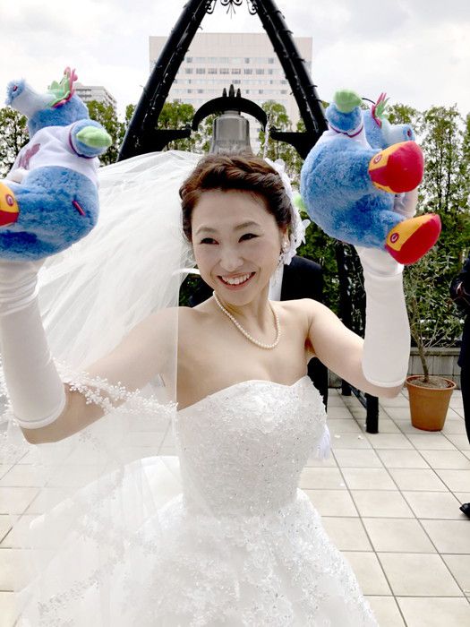 そして、おふたりの共通の趣味は、広島東洋CARP!ということで、フラワーシャワーの後は、ブーケトスではなくCARPのマスコットである“スライリー”トス!