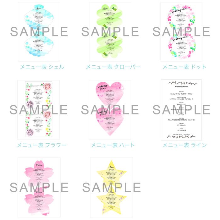 手作りするなら、ご家庭にあるような一般的なプリンターに収まる小さめメニュー表orドリンクメニューだけの小ぶりなタイプがおすすめ(写真はロマンティックデザイン)。席次表などたくさん掲載したい場合は分けて作ると作り直しも少なくすむうえ、より丁寧な感じがして◎。