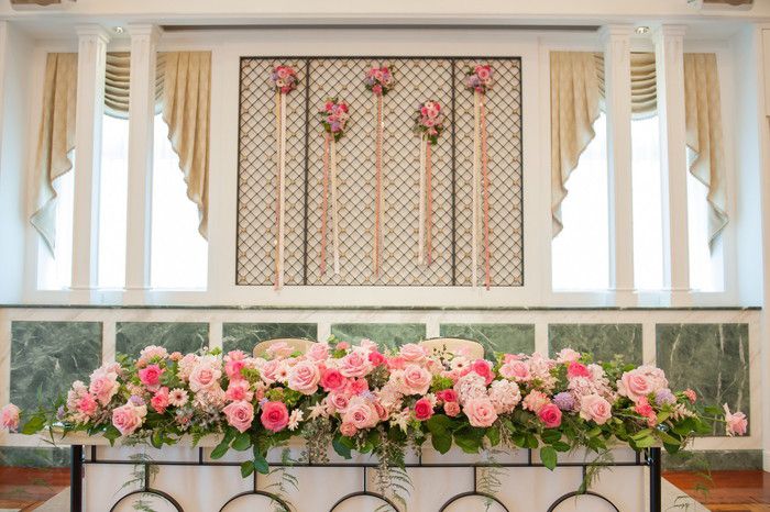 「春だからお花いっぱいにしてもらいたくて」との言葉通り、披露宴会場のメインとなる高砂には、後ろの壁にも装花&リボンをプラス♡明るいピンクをメインに、グリーンをプラスしたとても華やかな高砂に仕上がりました!