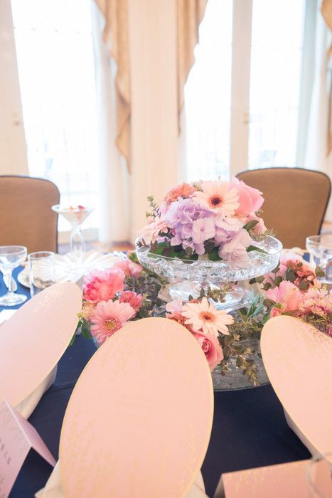 そして、ゲストテーブルは、ネイビーのテーブルクロスに、装花は高砂より控えめなダスティーピンクや淡いパープルをメインに。