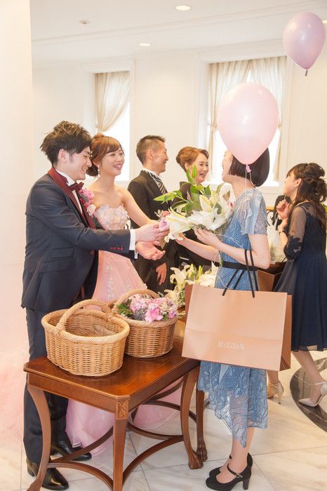 そして、これらの素敵な装花。お花が好きなご友人が多かったこともあり、テーブル装花以外にもチャペルと高砂のお花も送賓時にプチギフトと一緒に渡せるように式場に依頼をされたそうです。小分けにラッピングした装花は、男性ゲストがスーツに挿してくれたりと、ゲストにとても好評だったそう♡