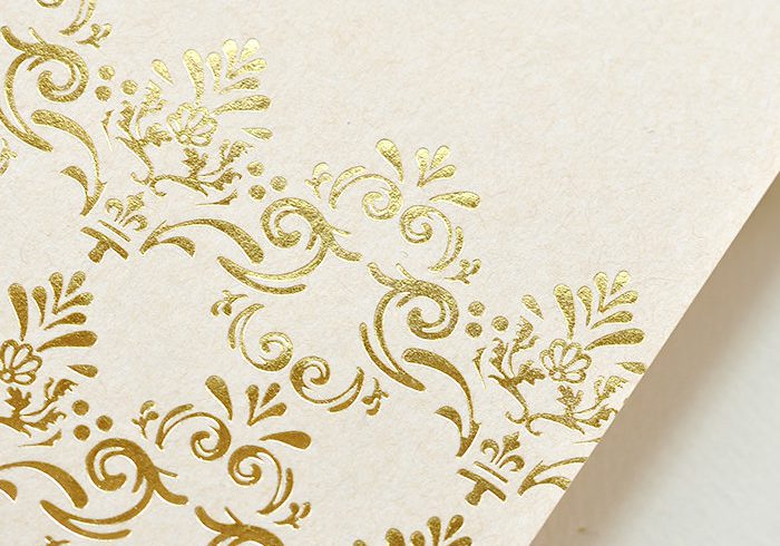 白い用紙にほんのり凹凸の影が落ちる繊細な加工。エンボスとは印刷面に特殊なインクを乗せて一部だけ膨らんで見せたり、紙を凸版と凹版で挟んで圧力をかけ紙に立体感を与える加工のこと。色は紙そのものですが、繊細な模様や文字にアクセントをつけたりと繊細で豪華な加工が施せます。