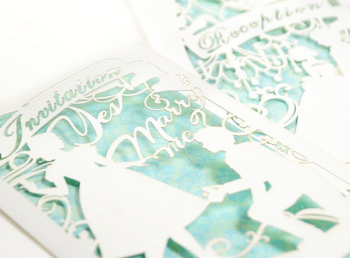 トムソンでは難しいような、入り組んだ細いデザインもカットできるので、ちょっと変わった招待状を使いたいなと思われているならおすすめ。ただし版代がかからない分1枚ずつの切り出しになるので、印刷代はプリントオンリーよりちょっとお高めです。