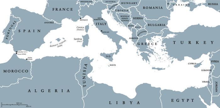 北と東ををユーラシア大陸、南をアフリカ大陸で囲まれた海が地中海です。地中海に面した国はたくさんあり、フランスやイタリア、エジプト、スペインなど20以上の国と自治区でできています。
