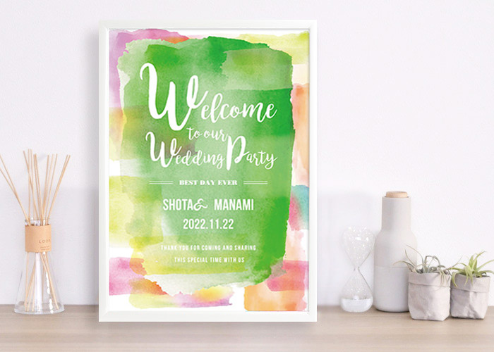 お部屋にマッチするウェルカムボードにも海外風の水彩タッチを取り入れて。水彩デザインはブルー・ピンク・グリーンの中から選べます。