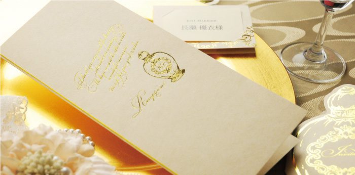 腰の位置でキュッと絞って短いカバースカートなどがふんわり広がる、エレガントな華やぎデザインには席次表「パフューム」がオススメ。オフホワイトのマットな台紙にゴールドの香水モチーフが箔押しされた上品なアイテムです。