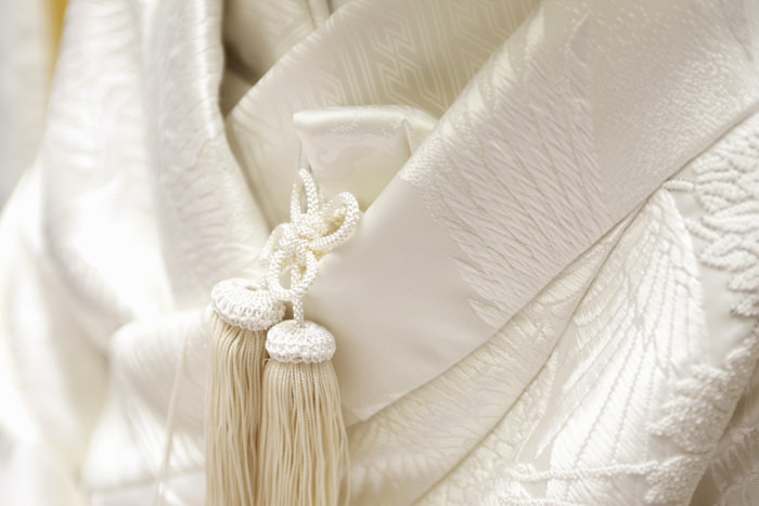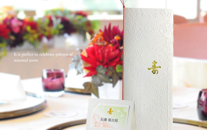 様々なデザインが登場している和装(白無垢)には、伝統や格式といった重厚感と、白の清楚さを感じさせる正統派な席次表「華縁(はなえにし)」はいかがでしょうか。縁結びの赤い糸がクラシカル&ゴージャス。
