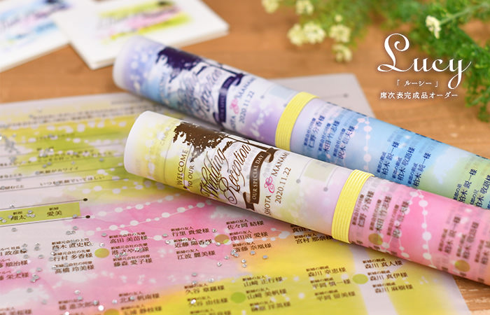 女の子の憧れチュールをたっぷり使用したチュールレースも今大人気。何層にも重なったスカートが陽に透けて健康的で優しい花嫁を演出するデザインには、トレーシングペーパーの透け感と水彩画調デザインが幻想的な席次表「ルーシー」がオススメです。ロール加工は有無選べるので会場コンセプトに合わせて選んでみては。
