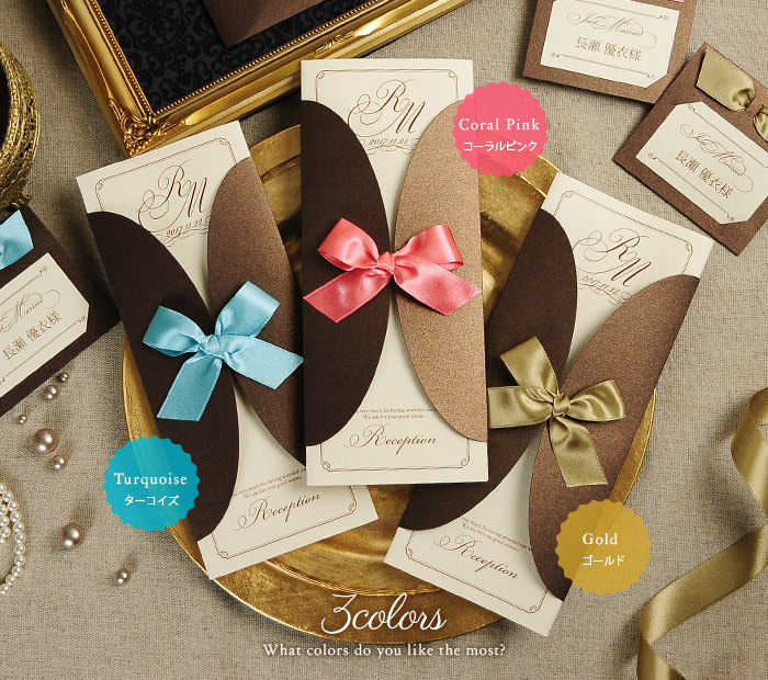 大きいリボンをたくさん結びたい!女性の大好きなモチーフの一つですよね。こちらには大きなサテンのリボンをリンクコーデさせられる席次表「ルネ」はいかがでしょうか。コーラルピンク・ターコイズ・ゴールドの3色から選べますが、オプション料金追加でドレスと同じ色のリボンにチェンジしても楽しいかも。