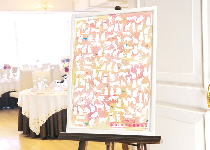 ウェルカムスペースが比較的広め&大きなイーゼルが置ける場合におすすめなのが、スペース丸ごと活かせるような床置きやとっても見やすい大きめイーゼルを使用するパターンです。床置きにはナチュラルテイストが魅力な木製ペイントボードシリーズ、大きなイーゼルにはゲストみんなが寄せ書きしてもらうような寄せ書きタイプ、大きな写真が映える写真メインのウェルカムボードがおすすめです。