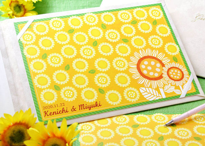 受付スペースに必要なものといえば、芳名帳。こちらは珍しい寄せ書きタイプのゲストブックです。ひまわりのお花のところにゲストにお名前を書いていただくというもの。こんな芳名帳ならリラックスできそう!受付から楽しくおもてなしできますよね♡