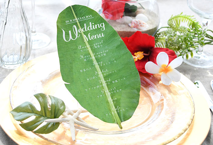 思わず「本物!?」と見まちがえそうな葉っぱをかたどったメニュー表。紙製ですがなんともリアルな質感!南国リゾートに来たみたいなわくわくした気持ちになれそう♡お料理をますます引き立ててくれる楽しいメニュー表です。