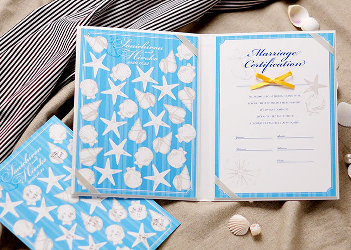 人前式や教会式ならこんなゲスト参加型の結婚証明書はいかがですか?シェルやスターフィッシュのイラストがちりばめられた爽やかなデザイン♡イラスト部分にゲストにお名前を書いていただくようになっています。夏の結婚式の思い出をずっと残せる結婚証明書です。