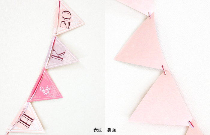 こちらは「HAPPY WEDDING」の文字とふたりのイニシャルと日付が入ったおしゃれなガーランドです。大人っぽいピンク×ラベンダーの配色にさりげなくレース柄があしらわれています。