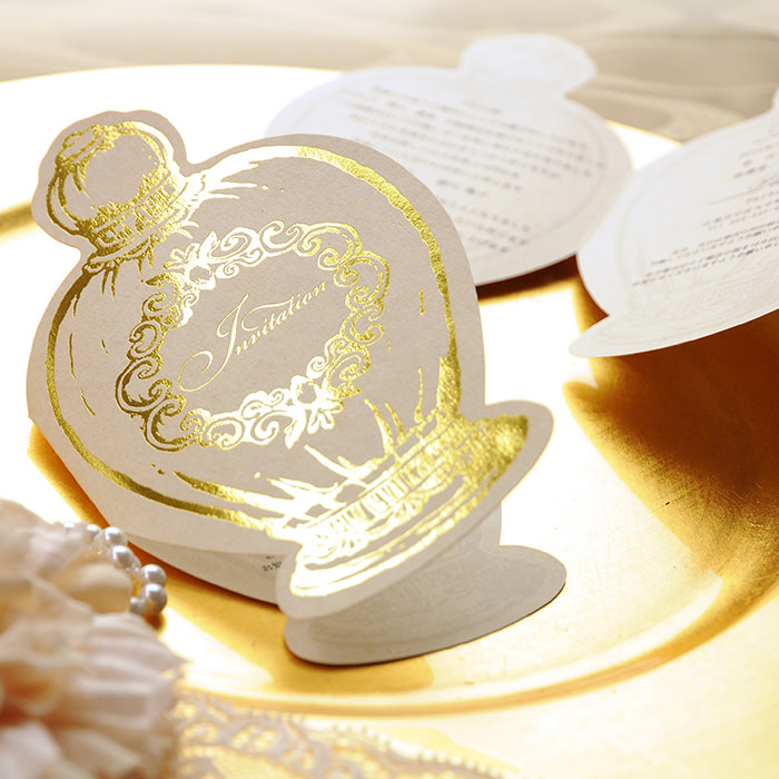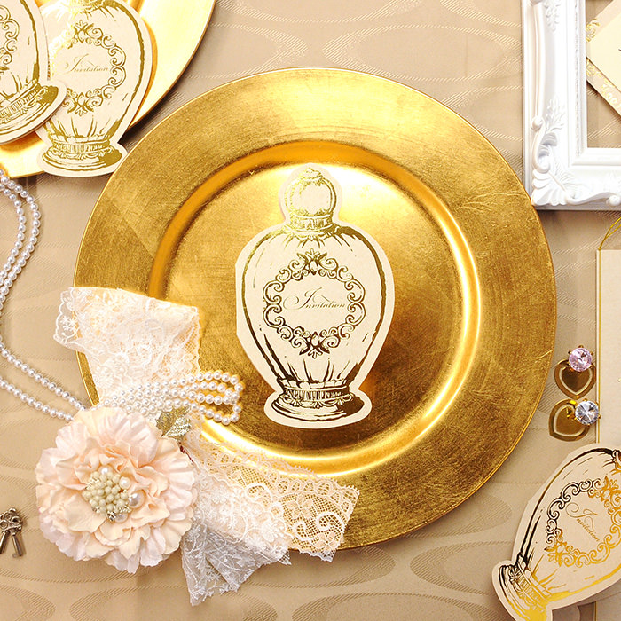 箔押しと呼ばれる印刷方法を使ったゴールドアイテムは、お祝いの席にぴったりの高級感!こちらは香水のボトルをイメージして作られたエレガントなデザインの招待状。ゲストの期待が膨らみます。