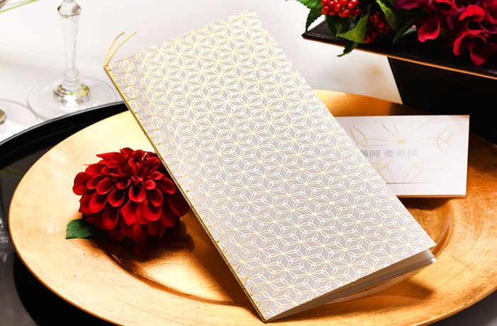 和な挙式にもゴールドアイテムは大活躍。こちらのペーパーアイテムは、あえて金の輪繋柄のみで仕上げられた、モダンさと繊細さを感じさせる、粋な「和」の席次表です。