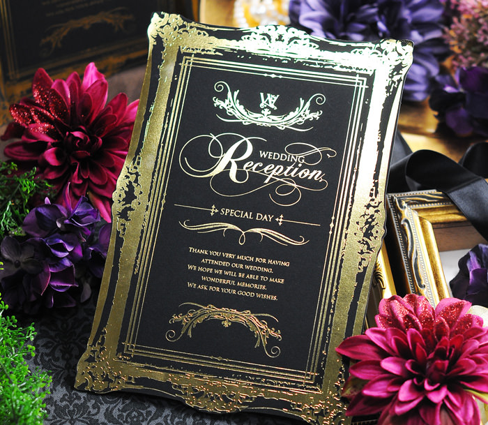 結婚式に黒?!と思われるかもしれませんが、シックで重厚なデザインは特別な日の演出にもぴったり。大人でビターな高級感あふれる組み合わせです。