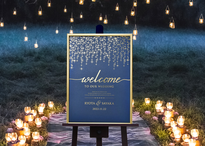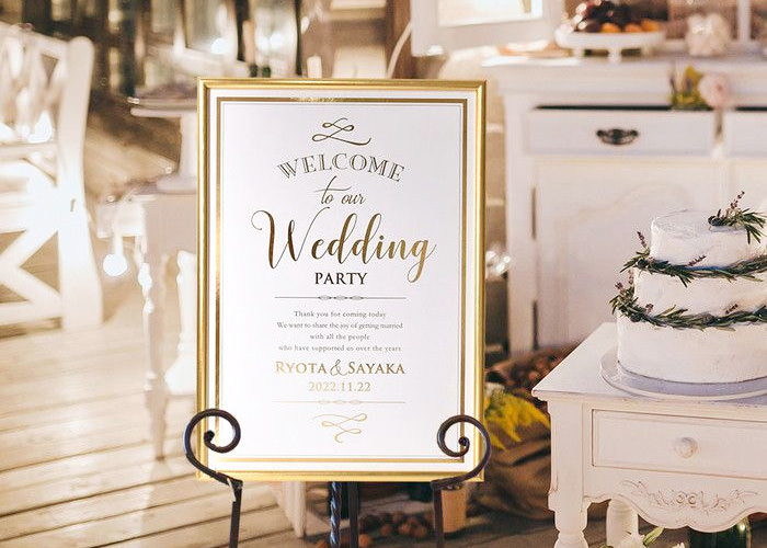 ゴールドフレームを使用したウェルカムボードは上品さと華やかさを両方叶えるおしゃれマストアイテム。印刷にもゴールドが使われていれば特別感もさらにアップ♡