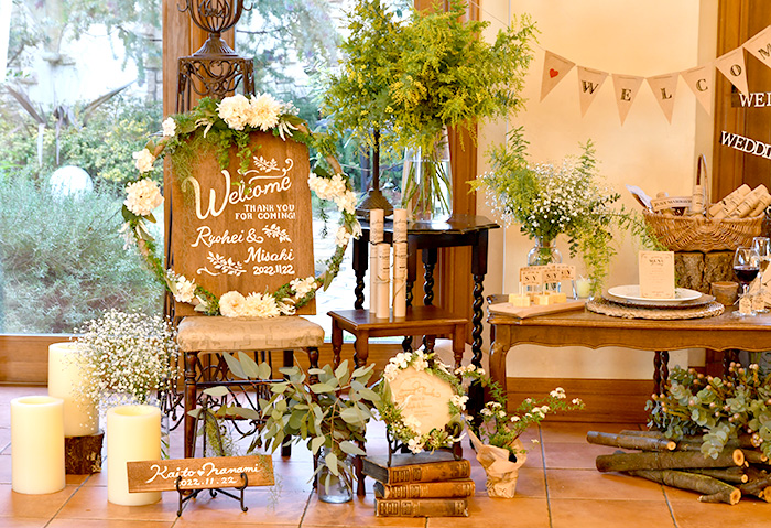 爽やかで青々と茂る木々を思わせるウッドとグリーンの組み合わせは、優しくて健康的な印象。ウェルカムスペースには手作り感や温もりのあるアイテムをしっかり取り入れて、ゲストをお迎えする癒しの空間にしてみては。