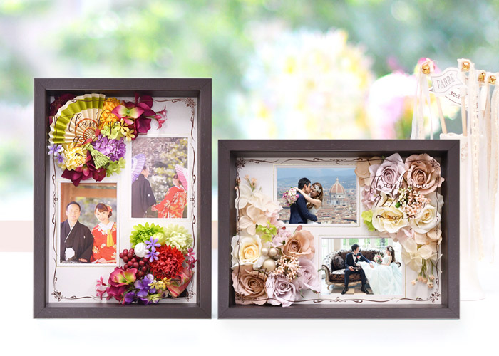 シックなブラウンフレームと、爽やかなホワイトフレームがあり、それぞれ多彩なアレンジが選べるようになっています。さらに使いたいお写真にあわせてタテ・ヨコも選べます。
