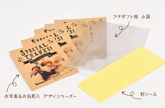 お見送り時に、ゲストひとりひとりに手渡しするプチギフト。こちらはお写真とお名前入りのラッピングキットです。クラフト紙がおしゃれ!!