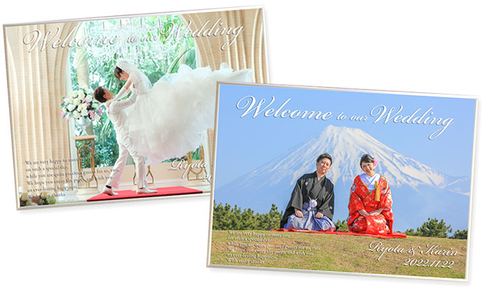 前撮りをプロにお願いするという方はこちらのウェルカムボードがおすすめ。高解像度の美しいお写真を活かせる高品質なフォトウェルカムボードです。