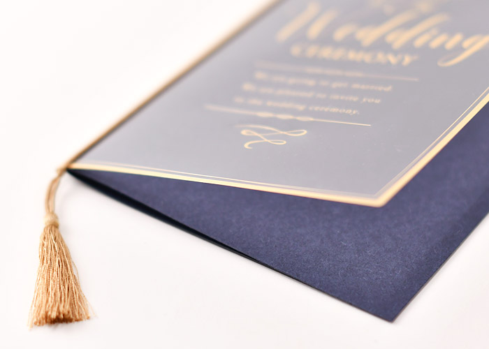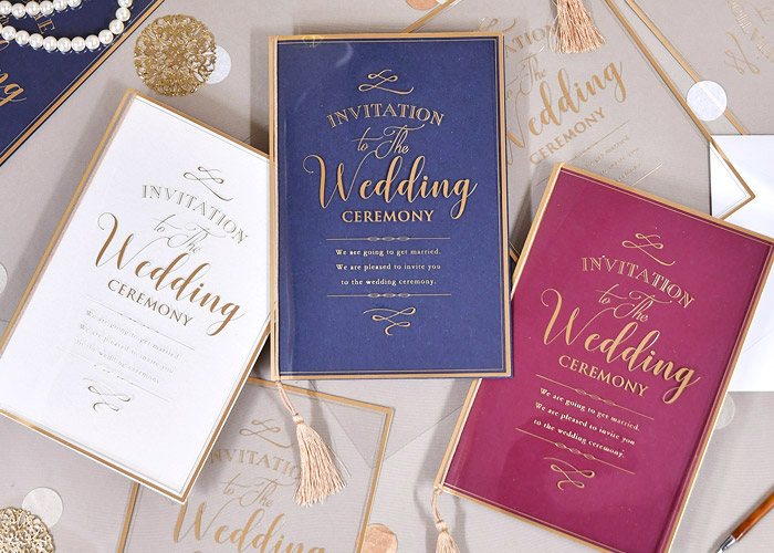 招待状にクリア素材が使われていたら、その目新しさからゲストの印象に残るはず。こちらの招待状「クレール」は透明フィルムにゴールドの装飾を施した大人ラグジュアリーなクリアペーパーアイテムです。