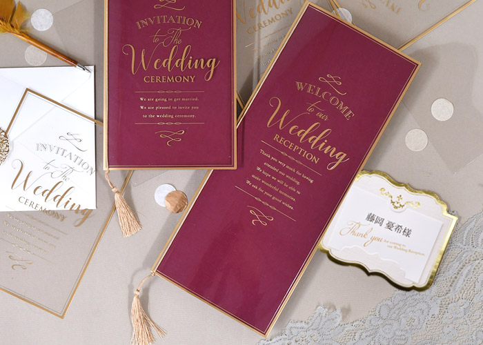 台紙のカラーバリエはホワイト・ネイビー・ワインの3種類。席次表と合わせて用意したいクリアアイテムです。