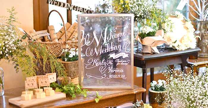 たっぷりのグリーン装花と合わせてアレンジしたい、ナチュラルウェディングにぴったりな透明ウェルカムボード。周りのアイテムに馴染んで優しい光を放ちます。