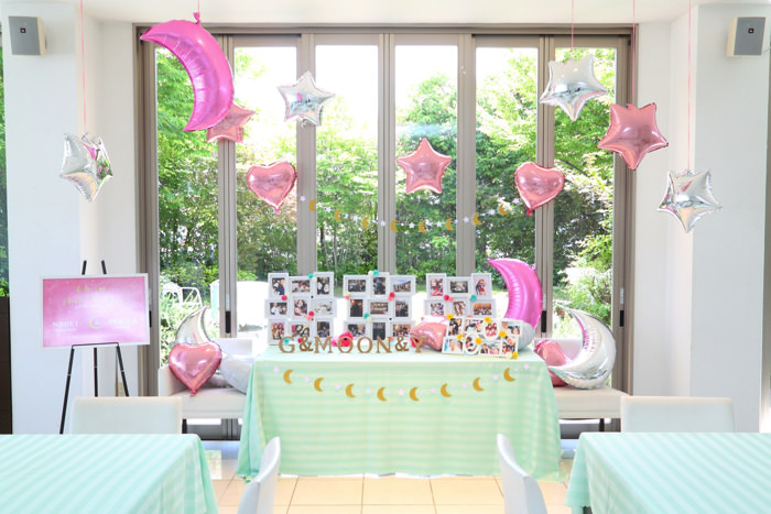 1日1組限定のゲストハウスを丸ごと貸切のウェディング♡青空が綺麗な、最高のお天気だったそうです。ウェルカムスペースは、月と星のバルーンで、華やかに彩られました。