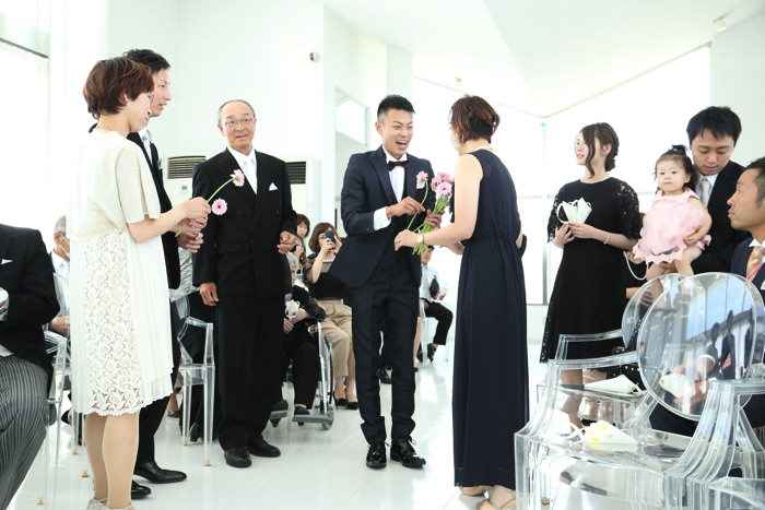 1つ目の演出には、「ダーズン・ガーベラ」の演出です。はじめに、新郎が入場の際にゲストから新婦の好きな花であるピンクのガーベラを受け取って入場。新婦の元へ到着後、新婦に手渡ししてプロポーズし、新婦がその花束の1本を新郎の胸に挿して「OK」するという演出です。