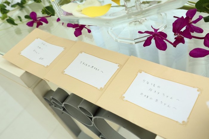 2つ目の演出には、5年後の自分たち・月ちゃん・そして花嫁さんのお腹にいる赤ちゃんへ向けた、ラブレターをお互いに書きあって箱におさめるという、ラブレタータイムカプセルの演出をされました。