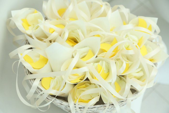 ゲストからのお祝いフラワーシャワーの中には、月の形をしたかけらが♡ところどころに、月をモチーフとした演出を取り入れることにこだわられた、とっても素敵な披露宴ですね♡