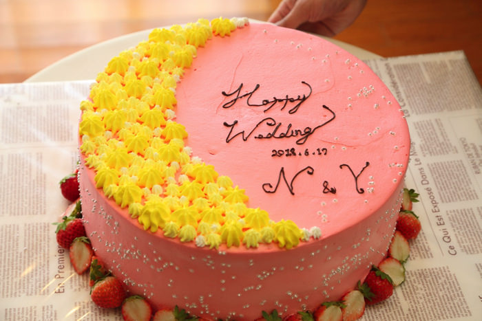 高砂やウエディングケーキも、月をモチーフにデザインされました。ウェディングケーキは、ピンクと黄色がマッチしたオシャレで奇抜なデザインに♡周りには、いちごで囲んでとってもキュートなケーキです!